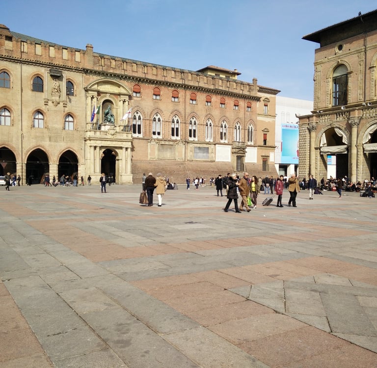 We start at Piazza Maggiore, or piazza del comune, as it was then called. It’s the beating heart of the city, surrounded by government palaces. Sometimes it functioned as a market, sometimes as a stage for the theatrics of political power. Today there are some vendors here and there selling fruit and vegetables, eggs and chestnuts, herbs and cheese.